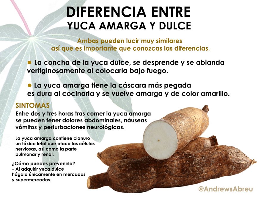 Durante mis 25 años como investigador en el cultivo de la yuca, ni a nivel de la cuenca del Lago de Maracaibo, ni estados vecinos, nunca he encontrado plantaciones comerciales de yuca amarga, todas las visitadas son de yuca dulce; sin embargo, ante la posibilidad de que personas por desconocimiento, o intencionalmente sin considerar el daño que pueden causar, estén comercializando yuca amarga para consumo humano directo, es importante orientar al consumidor de cómo pueden diferenciar un tipo de otro.